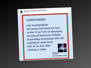 Aufgrund einer pro-paläsinensischen Demo in Berlin-Charlottenburg warnt die jüdische Gemeinde alle Juden der Stadt eindringlich, das Gebiet rund um Adenauerplatz und Ku'damm zu meiden. Juden können sich in der deutschen Hauptstadt nicht frei und sicher bewegen.Ständige Überwachung