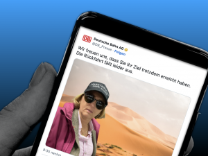 Die Deutsche Bahn twitterte am Sonntag eine Bildmontage der AfD-Politikerin Beatrix von Storch, die sie in der Wüste zeigte. Dazu schrieb das Unternehmen: „Wir freuen uns, dass Sie Ihr Ziel trotzdem erreicht haben.“ Ein geschmackloser Satz, der auf Twitter auch unter ÖRR-Journalisten Empörung auslöste.