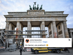 Die Reinigungsarbeiten am Brandenburger Tor sind nach dem Farbanschlag der „Letzten Generation“ noch immer nicht abgeschlossen. Aktuell steht ein Gerüst vor dem Tor - und die Klimakleber drohen sich das zunutze zu machen. Die Polizei erklärt auf Anfrage von Apollo News, dass man seine Präsenz deshalb nun verstärke.