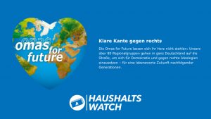 Fördergelder in Höhe von über einer Million Euro überweist Habecks Wirtschaftsministerium den „Omas for Future“. Die Generation Ü50 stelle „56 Prozent der Wähler:innen“ und soll daher auf Klimalinie gebracht werden. In „Alltagstipps“ wird ihnen empfohlen, sich „politisch für den Klimaschutz“ zu engagieren.DSA