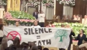 Mitglieder der Klimaschutzgruppe „Extinction Rebellion“ störten mit einem pro-palästinensischen Protest die Osternachtsmesse in der Saint Patrick's Kathedrale (New York). Rund 45 Minuten nach Beginn unterbrachen sie den von Kardinal Dolan geleiteten Gottesdienst, indem sie mit einem Banner "Schweigen = Tod" zum Altar zogen.