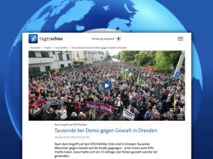 In einem Artikel berichtet die Tagesschau über die Demonstration in Dresden in Folge des Angriffs auf den SPD-Politiker Matthias Ecke. Als Titelbild nutzt der Sender dabei ein Foto auf dem der Aufruf „Nazis töten“ zu lesen ist.