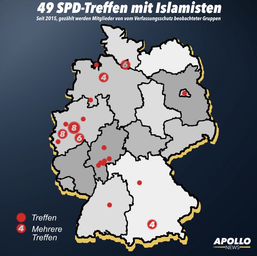 Vielen Dank, Apollo News, für diese aufschlussreiche Recherche! Man kann es fast nicht glauben, wie diese ehemalige deutsche Volkspartei, die doch unbestreitbar in der BRD großes geleistet hat, sich heute positioniert: Diese SPD, deren heutiges Führungspersonal so gerne mit dem Finger auf andere zeigt, trifft sich anscheinend regelmäßig und in herzlicher Runde mit religiösen Extremisten und nationalistisch-völkischen Ideologen, die im Grunde Agenten ausländischer Mächte sind und die, wenn sie könnten bzw. aus demographischen Gründen bald können, die Verfassung Deutschlands mit Füßen treten würden.