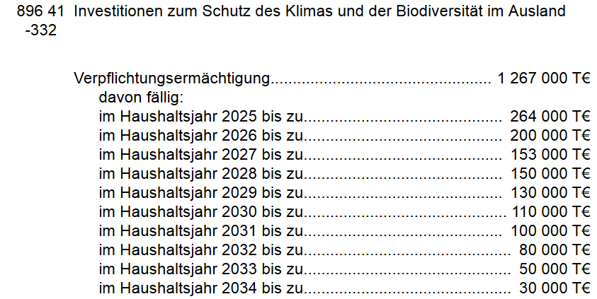 So möchte die Bundesrepublik 2024 für Investitionen für den Schutz des Klimas und der Biodiversität im Ausland 685.006.000 Euro ausgeben. Gleichzeitig hat der Bund schon weitere Ausgaben unter diesem Haushaltspunkt für die nächsten Jahre verplant. Aus Verpflichtungsermächtigungen resultieren für die Haushaltsjahre 2025 bis 2034 weitere Ausgaben in Höhe von insgesamt 1.267.000.000 Euro. Zusammen fast 2 Milliarden Euro und dabei sind die neuerlichen Versprechen von Olaf Scholz, die er bei der COP28 versprach, wo er 4 Milliarden Euro für den Klimaschutz zusagte, noch gar nicht mit inbegriffen.