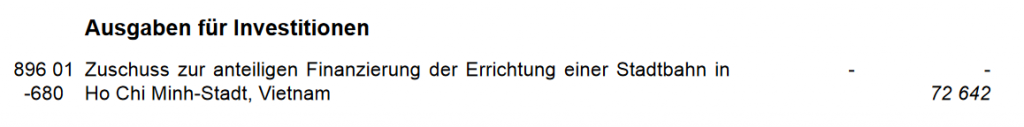 Die Stadtbahn der vietnamesischen Stadt Saigon (heute offiziell Ho-Chi-Min-Stadt) soll mit 72.642.000 Euro bezuschusst werden. Begründet wird dieses Engagement in ausländische Infrastruktur, während in Deutschland die Bahninfrastruktur durchaus Ausbaureserven hat, damit, dass das Projekt unter Beteiligung/Projektführung der deutschen Wirtschaft realisiert wird, der Zuschuss die bilateralen Beziehungen zu Vietnam fördere und das Projekt für die Entwicklung Vietnams aus wirtschafts-, verkehrs-, klimaschutz- und umweltpolitischen Gründen eine herausragende Bedeutung habe.