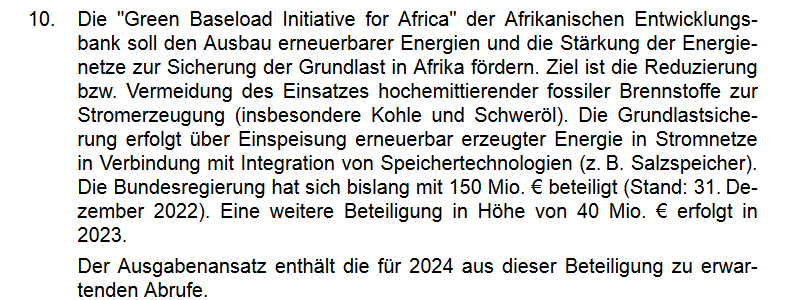 Auch der Ausbau erneuerbarer Energien und der Stromnetze in Afrika zur Sicherung der Grundlast liegt unserer Regierung am Herzen. Da erneuerbare Energien, wie allgemein bekannt ist, nicht grundlastfähig sind, wird auch der Aufbau von Stromspeichern gefördert. Stromspeicher hätte auch Deutschland bitter nötig. Die Ausgaben für dieses Projekt sind enorm und hätten auch in Deutschland zu einer Verbesserung der Situation beitragen können. Bis Ende 2023 hat Deutschland 190.000.000 Euro an die Green Baseload Initiative for Africa gezahlt. 2024 sollen noch weitere 45.000.000 Euro hinzukommen.