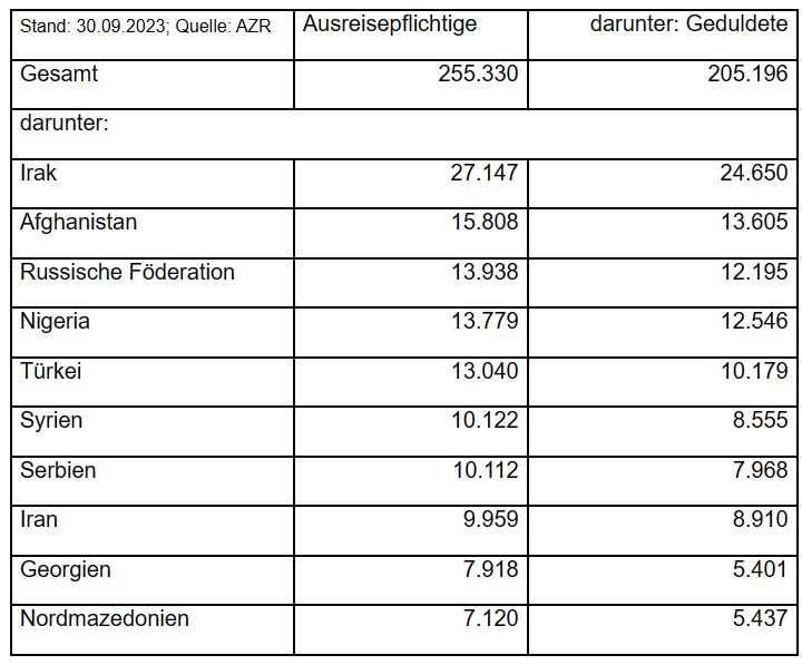 Dann folgen Staaten wie Afghanistan, Russland, Nigeria, die Türkei und Syrien. Aus der Antwort des Bundesinnenministeriums geht jedoch auch hervor, dass von den 250.000 abschiebepflichtigen Personen, 200.000 einen Duldungsstatus innehaben. Bei jeder relevanten ausreisepflichtigen Gruppe liegt dies überwiegend vor. Obwohl diese Personen also kein Recht zum Aufenthalt in Deutschland haben, können sie trotzdem nicht abgeschoben werden, da andere rechtliche Gründe, Kapazitätsprobleme oder fehlenden Papiere dies verhindern.