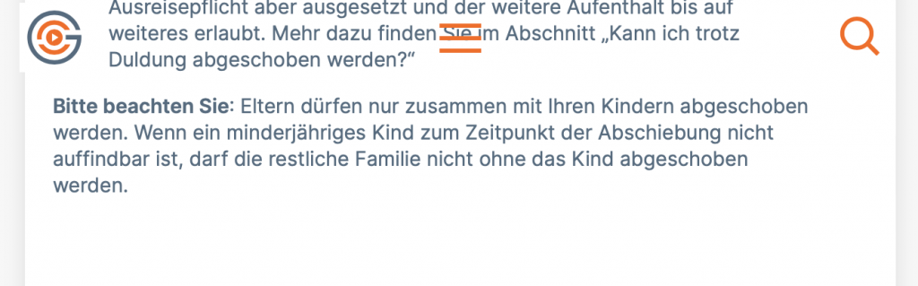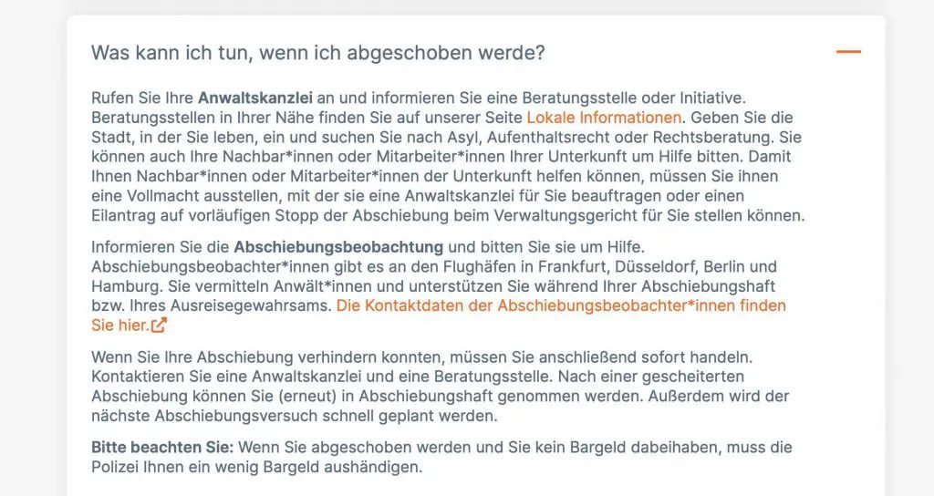 In einem anderen Chatverlauf vom Oktober 2023 fragte ein Asylbewerber: “Was kann ich tun, wenn ich ausreisepflichtig bin, die Aufforderung dazu (durch Nachlässigkeit meines Anwalts) nicht erhalten habe und jetzt 3 Monate später eine Abschiebung droht?” Der Leser beschreibt zudem, zuvor eine Duldung für 6 Monate durch seine Arbeitstätigkeit erhalten zu haben. Darauf antwortet erneut die „Community Managerin“, er könne sich über seine Rechte mit einer Duldung auf der Plattform „Handbook Germany“ informieren.