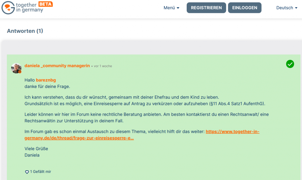Darauf antwortet eine Mitarbeiterin von „Handbook Germany“ namens “daniela_communitymanagerin”: “Danke für deine Frage.” und erklärt: “Grundsätzlich ist es möglich, eine Einreisesperre auf Antrag zu verkürzen oder aufzuheben (§11 Abs. 4 Satz 1 AufenthG).” Sie empfiehlt zudem, einen Anwalt zur Unterstützung zu kontaktieren.