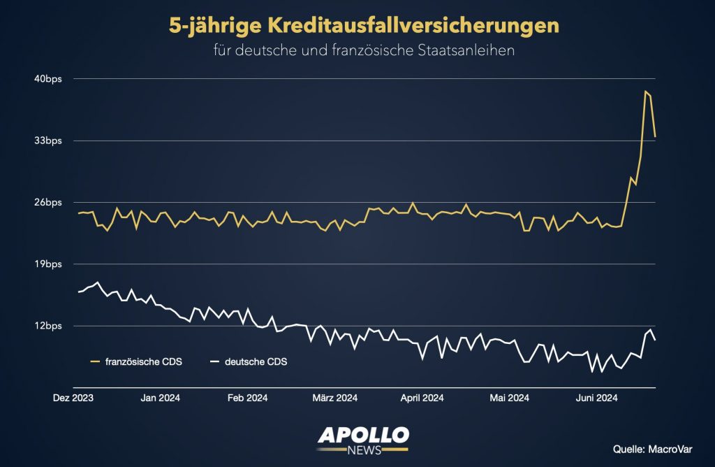 Nachdem der französische Präsident Emmanuel Macron kürzlich das Parlament auflöste, schossen in Frankreich die Versicherungsprämien gegen einen Kreditausfall in die Höhe – und befinden sich auf dem höchsten Niveau seit Ausbruch der Corona-Pandemie.
