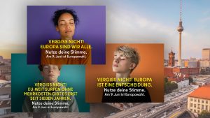 Eine Plakatkampagne der Stadt Berlin soll die Bürger zur Stimmabgabe bei der Europawahl 2024 aufrufen und fordert dabei eine „aktive“ Entscheidung für „ein starkes Europa“ und unterschwellig gegen EU-skeptische Parteien. Ansonsten gefährde man Frieden, Freiheit und kostenloses Roaming in der EU.