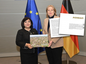 Die Bundestagspräsidentin Bärbel Bas trifft sich mit einer aserbaidschanischen Politikerin und hält eine Broschüre in die Kamera, mit der Aserbaidschans Vernichtungskrieg gegen das armenisch besiedelte Berg Karabach legitimiert wird.Täter-Opfer-Umkehr