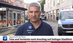 Die tagesschau berichtet mit einem Korrespondenten direkt aus Solingen. Statt das „südländische“ oder „arabische“ Aussehen des Täters zu nennen, spekuliert man über das Motiv: Der Anschlag könnte verübt worden sein, weil „man beispielsweise vielleicht gegen Ausländer ist“.