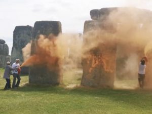 Klima-Extremisten der Gruppe „Just Stop Oil“ besprühten am Mittwoch eines der ältesten und bedeutendsten Monumente Großbritanniens mit Farbe - die Steinformation „Stonehenge“.