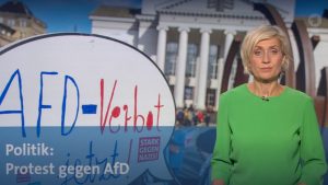 Menschen mit Behinderung und Ausländer sind weniger wert, sollen Politiker der AfD sagen, behauptet die Tagesschau in Einfacher Sprache. Belege dafür führt die Moderatorin nicht an. Stattdessen erklärt der Sender damit die Forderungen nach einem AfD-Verbot.