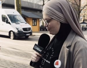 Für Radio Bremen konfrontierten zwei junge Muslima Passanten. Eine der Frauen trug einen Wassermelonen-Ansteckpin, bekannt als Symbol für antiisraelische Haltungen. Für Radio Bremen offenbar kein Problem.