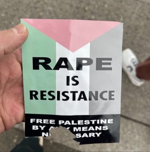 In New York haben pro-palästinensische „Aktivisten“ Sticker verteilt, welche die Vergewaltigung israelischer Frauen und die Ermordung von Säuglingen zum„Widerstand“ und zu einem notwendigen Mittel für die „Befreiung Palästinas“ erklären.