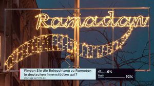 Viel Kritik gab es an der Beleuchtung, die Köln und Frankfurt zu Ehren des heiligsten islamischen Monats, dem Ramadan in einigen Straßen anbringen ließen. In einer Umfrage schlägt sich diese Kritik jetzt eindeutig wieder: Bei RTL lehnen 92 Prozent die Beleuchtung entschieden ab.