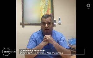 In einem ARD-Brennpunkt zum Krieg gegen Israel wurde am Sonntagabend ein Video von einem Arzt aus Gaza eingeblendet. Auffällig: Im Hintergrund war eine Landkarte zu sehen, die jedoch digital unkenntlich gemacht wurde. Allem Anschein nach zensierte die ARD die Karte eines fiktiven Palästinenser-Staats auf dem Gebiet Israels.