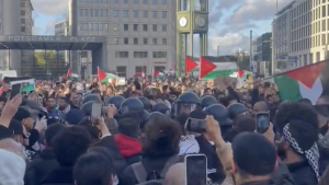 Trotz Demo-Verbots fand auf dem Potsdamer Platz in Berlin eine palästinensische Anti-Israel-Demo statt. Die an die tausend aggressiven Demonstranten umringten dabei Polizisten, die die Veranstaltung auflösen sollten.