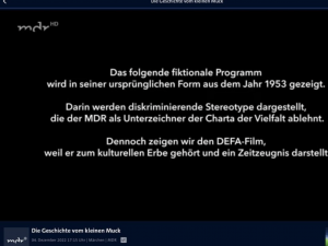 Nach Otto, Harald Schmidt und Schimanski fällt nun auch der kleine Muck dem linken Zeitgeist zum Opfer - beim MDR wird „die Geschichte des kleinen Muck“ nun mit einem Warnhinweis ausgestrahlt. Der 1953 in der DDR produzierte Film enthalte „diskriminierende Stereotype“.