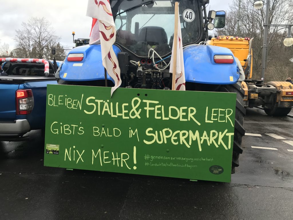 „Die Politiker leben in einer ganz anderen Welt als wir“, sagt der Mann. Er teilt diese Enttäuschung mit vielen anderen, die am Montag neben ihren Traktoren stehen und auf den Beginn der Demonstration warten. Ein Bio-Bauer, der Schafe und Kühe auf seinem kleinen Hof hält, erzählt uns, dass er einmal ein Fan von Christian Lindner war. „Aber er hat mich sehr enttäuscht, seit er in der Regierung ist“. „Vielleicht“, sagt der Landwirt, „hätte Lindner lieber im Pferdestall arbeiten sollen, als Knecht, als in die Politik zu gehen“.