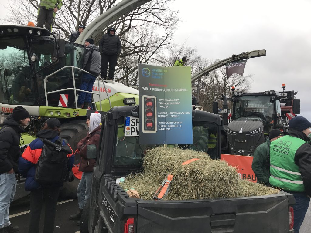 „Ich habe einen kleinen landwirtschaftlichen Betrieb mit 25 Hektar, die ich bewirtschafte“, erzählt uns einer der Landwirte, die wir zwischen Traktoren und LKWs im dichten Gedränge auf der Straße des 17. Juni antreffen. Er habe sich den Betrieb aufgebaut, weil seine Erwerbsminderungsrente nicht zum Leben reicht. Deshalb betreibt er „einen kleinen Gnadenhof“ für „Einstellerpferde, Rentnerpferde und Pensionspferde“, die nicht mehr beritten werden und bis zu ihrem Tod bei dem Mann leben. Im Sommer baut er Heu an, dass er im Winter verkauft, um zu überleben – „und nu wird uns das auch noch alles kaputt gemacht“. Alles werde immer teurer, es sei kaum noch möglich den Betrieb aufrechtzuerhalten, obwohl man arbeiten wolle.