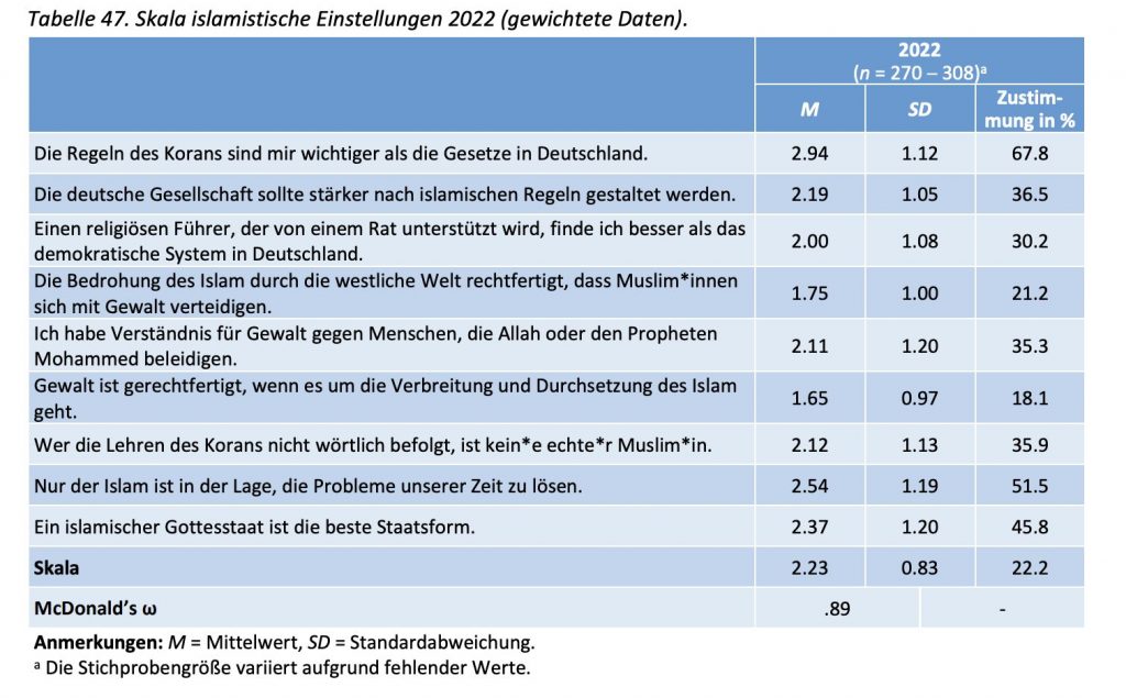 Mohammed beleidigen.“ 18 Prozent sehen Gewalt zur Durchsetzung des Islam per se als legitim an und ganze 45,8 Prozent stimmen der Aussage zu, wonach ein islamischer Gottesstaat die beste Staatsform wäre.