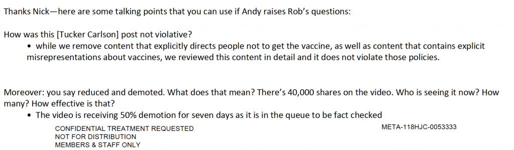 Dabei ging es wohl nicht nur um Posts einzelner, anonymer Nutzer, sondern auch prominenter Kritiker der Biden-Regierung und ihrer Corona-Politik, wie etwa Videos des damaligen Fox-News-Moderators Tucker Carlson. Laut Jordan habe das Weiße Haus versucht Videos von ihm von Facebook sperren zu lassen. In Reaktion schrieb das Unternehmen interne Talking Points für Treffen mit der Regierung, in dem der Konzern darauf verwies, dass man Carlsons Video-Sichtbarkeit bereits um 50 Prozent eingeschränkt habe.