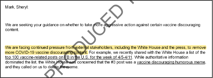 Sie zeigen ein massives Ausmaß der Einflussnahme von Seiten des Weißen Hauses unter Biden: „Wir stehen unter anhaltendem Druck von externen Interessengruppen, einschließlich des Weißen Hauses“ Inhalte zu entfernen, heißt es in einer E-Mail eines Facebook-Mitarbeiters an Facebook-CEO Mark Zuckerberg. Das Weiße Haus habe gar spezielle Posts erwähnt, die entfernt werden sollen, so etwa ein impfkritisches Internet-Meme:
