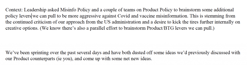 Durch den anhaltenden Druck von der Biden-Administration verschärfte Facebook dann seine Gangart gegenüber „Misinformation“: Die Facebook-Führung habe ihre Teams „gebeten, einige zusätzliche Policy-Hebel zu entwickeln, die wir ergreifen können, um aggressiver gegen Fehlinformationen zu Covid und Impfstoffen vorzugehen“, heißt es in E-Mails aus dem August 2021.