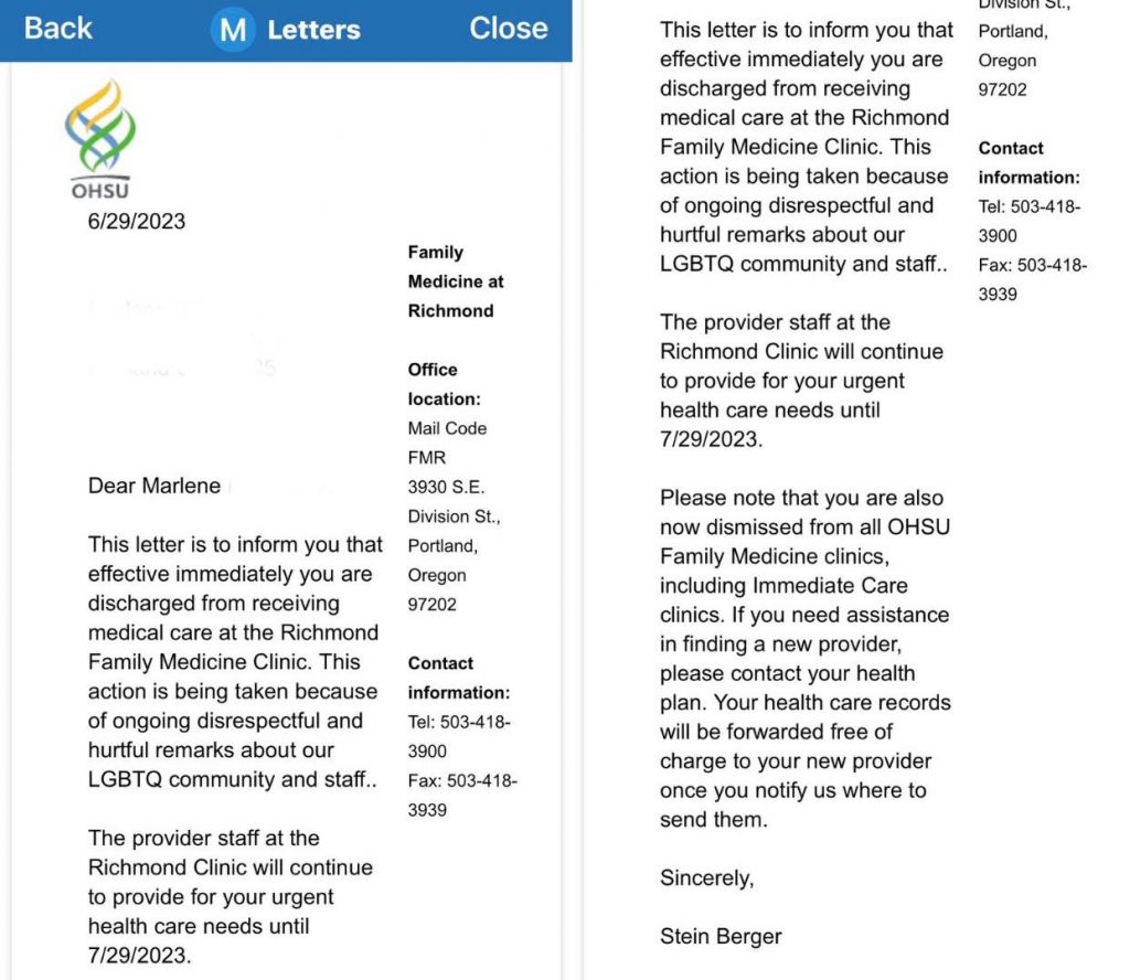 Ein paar Wochen später habe Barbera dann über die „MyChart“-App eine Nachricht vom Praxismanager der Oregon Health Sience University (OHSU) erhalten. Darin stand, dass die Richmond-Klinik eine „inklusive Klinik“ sei und „wir Vielfalt schätzen und uns dafür einsetzen“. Der Praxismanager warf Babera vor, „transphobe Äußerungen“ getätigt zu haben, die für die Mitarbeiter „verletzend“ gewesen seien. Noch am selben Tag erhielt Barbera dann eine formelle E-Mail, in der ihr mitgeteilt wurde, dass sie aus der Klinik ausgeschlossen wird.