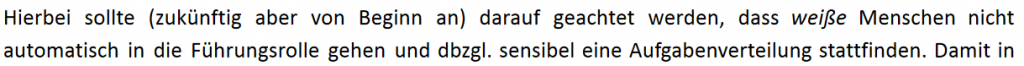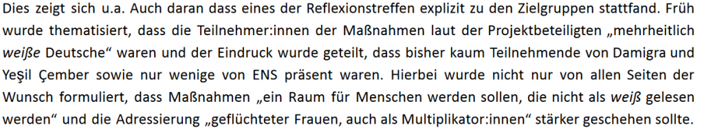 Interessant ist auch, auf welche Probleme aufgrund der Hautfarbe die Projektteilnehmer während des Projektes stießen. So wird in dem Evaluationsbericht darüber berichtete, dass früh darüber gesprochen wurde, dass die Projektbeteiligten „mehrheitlich weiße Deutsche“ waren. Dabei sollen Maßnahmen „ein Raum für Menschen werden sollen, die nicht als weiß gelesen werden“. Eine Lehre aus dem Projekt ist daher, dass zukünftig „weiße Menschen nicht automatisch in die Führungsrolle gehen“.