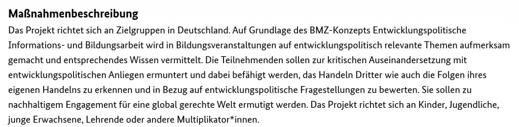Die beiden Projekte, die eine andere Maßnahmenbeschreibung stammen aus den Jahren 2013 und 2014. Leider ist der die Maßnahmenbeschreibung dort noch nichtssagender. „Projekt im Rahmen des Förderprogramms Entwicklungspolitische Bildung“
