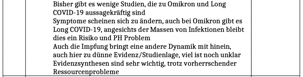 Auch das RKI zeigte sich vorsichtig: In dem Ergebnisprotokoll vom 7. September wurde vermerkt, „auch bei Omikron gibt es Long-COVID-19“, aber gleichzeitig gebe es „wenige Studien, die zu Omikron und Long-COVID-19 aussagekräftig sind“. Die Krisenstabsmitglieder mahnten also zur Vorsicht, setzten aber – wie bereits am 10. August – auf eine nüchterne Betrachtung.