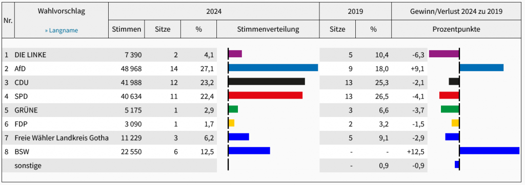 In Gotha ist das BSW sogar dreimal stärker als die Linke, von der sich das Bündnis Anfang des Jahres faktisch abgespalten hat. Die Links-Partei kommt nur noch auf 4,1 Prozent der Stimmen und hat damit Glück, dass es seit 2008 keine Sperrklausel bei den Kommunalwahlen in Thüringen mehr gibt. In den vier Landkreisen, in denen das BSW angetreten ist, konnte sich die Linke nur in Sonneberg – dem ersten Landkreis mit einem Landrat von der AfD – mit 8,0 Prozent vor dem BSW (6,9 Prozent) behaupten.