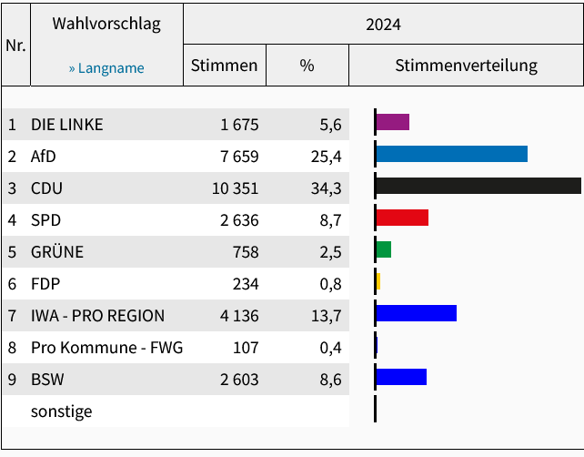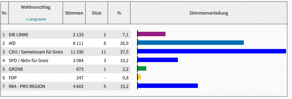 Exemplarisch sichtbar wird der geringe Einfluss des BSW auf die AfD-Wähler bei einem Vergleich der Ergebnisse von der Wahl des Stadtrats in Greiz mit denen zur Greizer Kreistagswahl. Die AfD ist in dieser Stadt bei der Kreistagswahl nur 1,5 Prozentpunkte schwächer als bei der Wahl zum Stadtrat, zu der das BSW nicht angetreten ist. Stattdessen fällt auf, dass alle Parteien, außer den Grünen bei der Wahl zum Kreistag schlechter abschnitten als bei der Wahl zum Stadtrat.