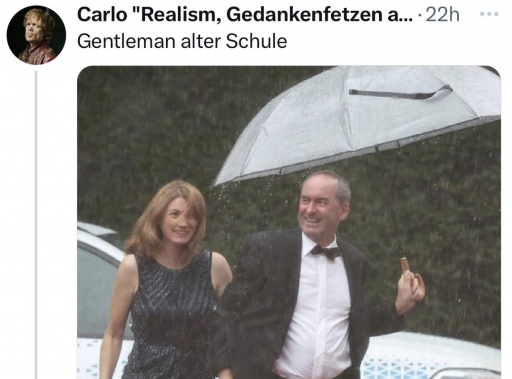 Auf dem Foto sieht man das glückliche Paar im Regen, Aiwanger unterm Regenschirm, seine Gattin nicht. Viele haben dieses Bild zum Anlass genommen, sich über Aiwanger zu empören. Dass er seine Frau so einfach nass werden lässt und egoistisch den Regenschirm für sich behält. Zu diesen spontanen Anhängern der feinen englischen Art, der neuen Knigge-Wache, gehören nicht zuletzt Bodo Ramelow, Ruprecht Polenz und Maybrit-Illner-Dauergast Carlo Masala.