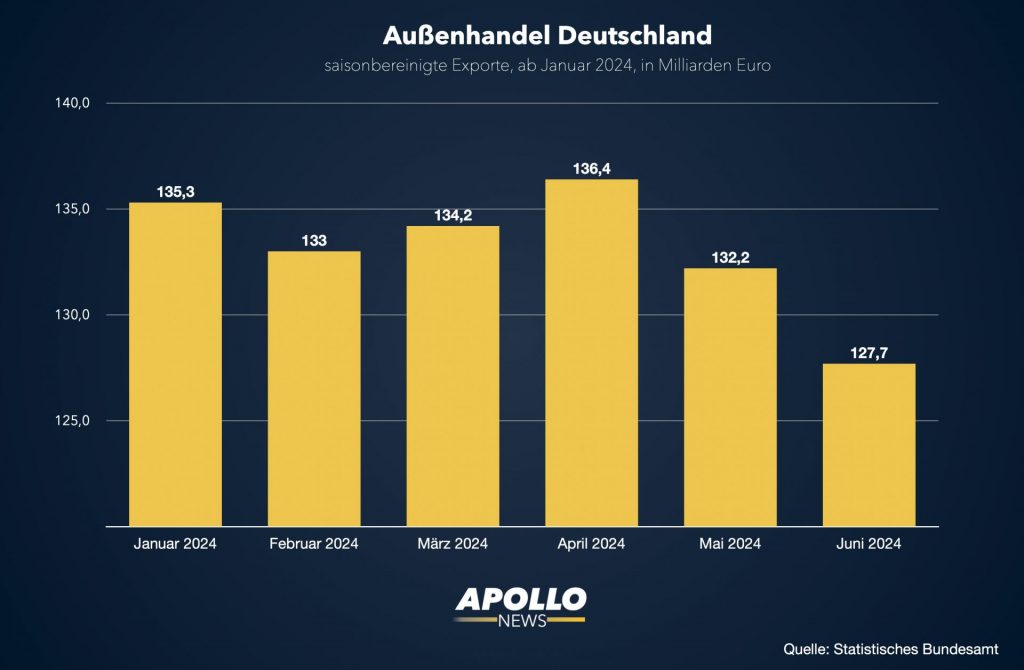 Die deutschen Exporte sind im vergangenen Monat auf 127,7 Milliarden Euro gefallen – ein Einbruch um 3,4 Prozent im Vergleich zum Mai des laufenden Jahres. Dabei hatten die Prognosen „nur“ mit einem Exportrückgang von 1,5 Prozent gerechnet. Über einen längeren Zeithorizont sieht der deutsche Außenhandel sogar noch schlechter aus: Im Vergleich zum Juni des vergangenen Jahres sind die Exporte sogar um 4,4 Prozent gesunken.