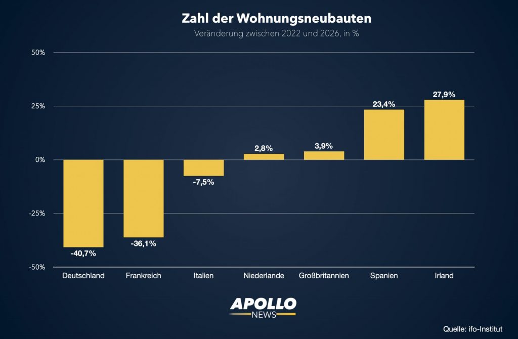 In einer Publikation hat das renommierte Münchner ifo-Institut zuletzt den europäischen Bausektor analysiert und ist zu desaströsen Ergebnissen gekommen – für Westeuropa und insbesondere für Deutschland. So soll der Wohnungsbau in den kommenden Jahren weiter schwach bleiben. Die Zahl der fertiggestellten Wohnungen soll in ganz Westeuropa bis 2026 um über 20 Prozent sinken, im Vergleich zu der Zahl der fertiggestellten Wohnungen im Jahr 2022. Für Deutschland wird im selben Zeitraum dafür ein Rückgang von 40,7 Prozent prognostiziert.