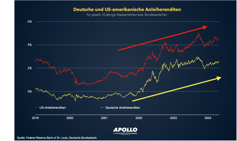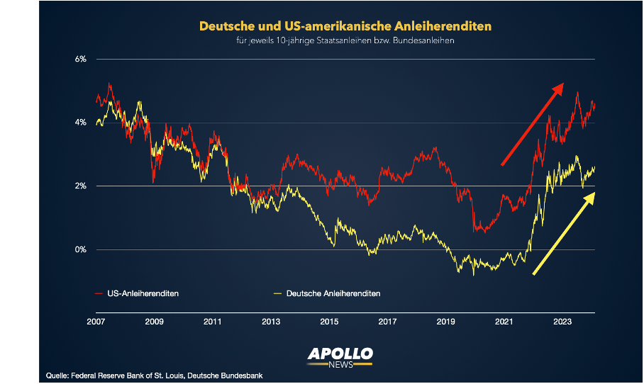 Jedoch gelten Staatsanleihen als sehr sichere Anlagewerte, da das Eintreten einer Zahlungsunfähigkeit eines gesamten Staates relativ unwahrscheinlich ist, insbesondere wenn man die größte und die drittgrößte Volkswirtschaft der Welt in Betracht zieht: Die USA und Deutschland. Analysiert man die Anleiherenditen der deutschen und US-amerikanischen Schuldtitel, kann man das Lagebild und die aktuelle Situation der US-Schulden einordnen – hinweg über mehrere Krisen der vergangenen fast 20 Jahre.
