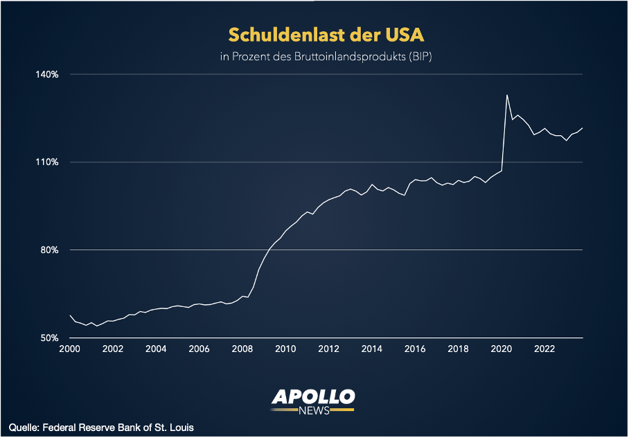 Dennoch spitzt sich die haushaltspolitische Krise der Vereinigten Staaten immer weiter zu. Insbesondere in den vergangenen 12 Monaten ist die Schuldenlast um über 6 Billionen US-Dollar (6.000 Milliarden US-Dollar) angestiegen, mehr als 25 Prozent davon blieb ungedeckt. Insgesamt belaufen sich die Verbindlichkeiten Washingtons auf über 33 Billionen US-Dollar – eine unglaubliche, kaum kontrollierbare Summe. Im Verhältnis zur Wirtschaftsleistung (BIP) sind die Schulden 2020 unter Donald Trump sprunghaft angestiegen, um die Folgen der COVID-Pandemie abzudämpfen.