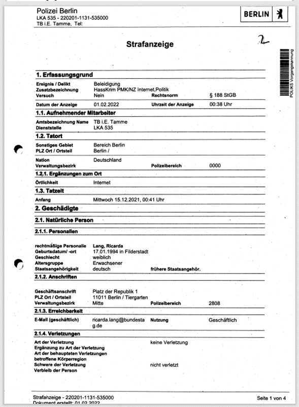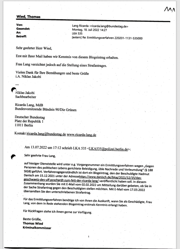 Die Anzeige ging schließlich beim LKA Berlin ein. Wie aus den Apollo News vorliegenden Ermittlungsakten hervorgeht, fragte das LKA dann Ricarda Lang per E-Mail an, ob diese Strafantrag stellen wolle. Über ihren Sachbearbeiter Niklas Jakobi ließ diese jedoch ausrichten, dass sie auf die Stellung eines Strafantrags verzichte.