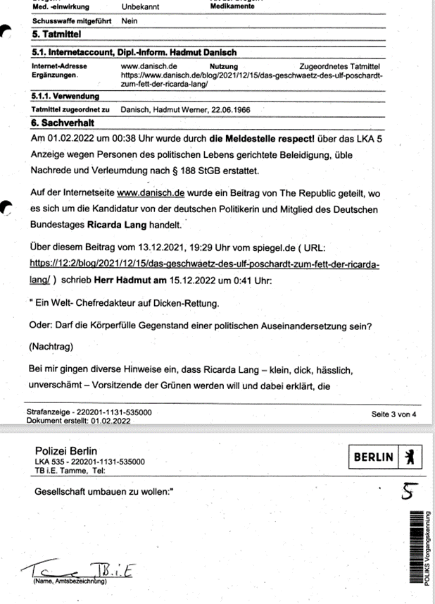 Genau dieser Artikel sollte Danisch zum Verhängnis werden. Die sogenannte „Meldestelle REspect!“ erstattete Strafanzeige gegen Danisch. Die Organisation hat sich selbst den Kampf „gegen Hetze im Netz“ auf die Fahnen geschrieben und aus diesem Grund schon über 8000 Anzeigen eingereicht. Die „Meldestelle REspect!“ wird durch zahlreiche staatliche Stellen, unter anderem das Bundesministerium für Familie, Senioren, Frauen und Jugend (BMFSFJ) finanziert. Konkret wurde Danisch wegen diesem Satz angezeigt: „Bei mir gingen diverse Hinweise ein, dass Ricarda Lang – klein, dick, hässlich, unverschämt – Vorsitzende der Grünen werden will und dabei erklärt, die Gesellschaft umbauen zu wollen.“