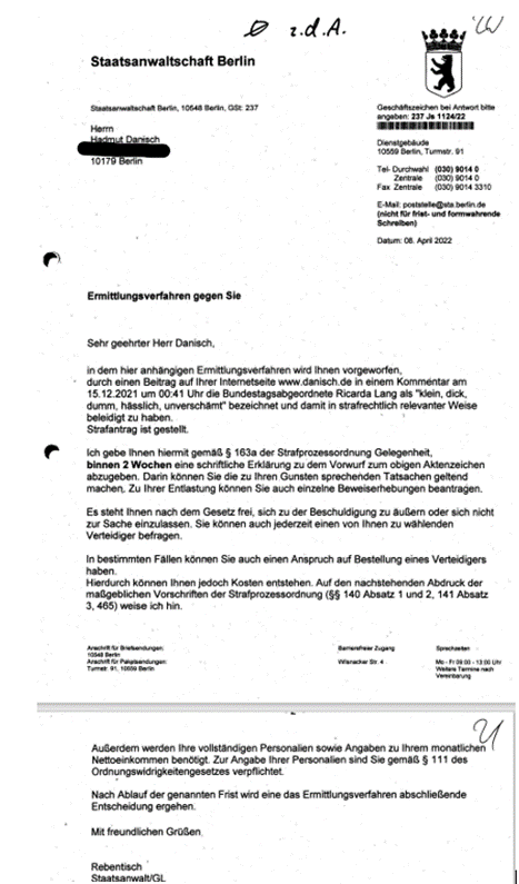 Die Anzeige landete dann bei der Berliner Staatsanwaltschaft. Dort wurde im März 2020 die „Zentralstelle Hasskriminalität“ vom grünen Justizsenator Dirk Behrendt eingerichtet. Diese „Zentralstelle“ soll nach eigener Aussage die „Strafverfolgungsbehörden insbesondere beim Kampf gegen Rassismus stärken.“ Der in Danischs Fall ermittelnde Staatsanwalt Matthias Rebentisch nahm bereits an Veranstaltungen der Amadeu-Antonio-Stiftung teil. Dieser Staatsanwalt teilte Danisch dann am 8. April 2022 schriftlich mit, dass ein Ermittlungsverfahren gegen ihn eingeleitet werde. Er habe Ricarda Lang als „klein, dick, dumm, hässlich, unverschämt“ bezeichnet und sie damit, in strafrechtlich relevanter Weise, beleidigt, heißt es in den Apollo News vorliegenden Ermittlungsunterlagen. Wegen des Vorwurfs der Hasskriminalität (konkret eine gegen eine Person des politischen Lebens gerichtete Beleidigung nach §188 StGB) hat die Berliner Staatsanwaltschaft in der Folge Ermittlungen gegen Danisch eingeleitet.