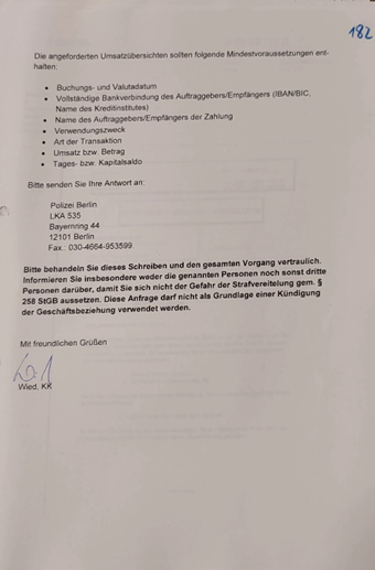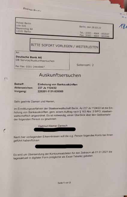 Im März 2023 wurde dann plötzlich das LKA wieder tätig. Man ersuchte bei der Deutschen Bank Auskunft wegen Danischs Spendenkonto. Eine solche Auskunft wird regelmäßig etwa bei Betrugs- oder Geldwäschedelikten abgefragt. Eine Kontoauskunft wegen des Tatbestandes der Beleidigung zu erfragen, ist hingegen völlig unüblich.