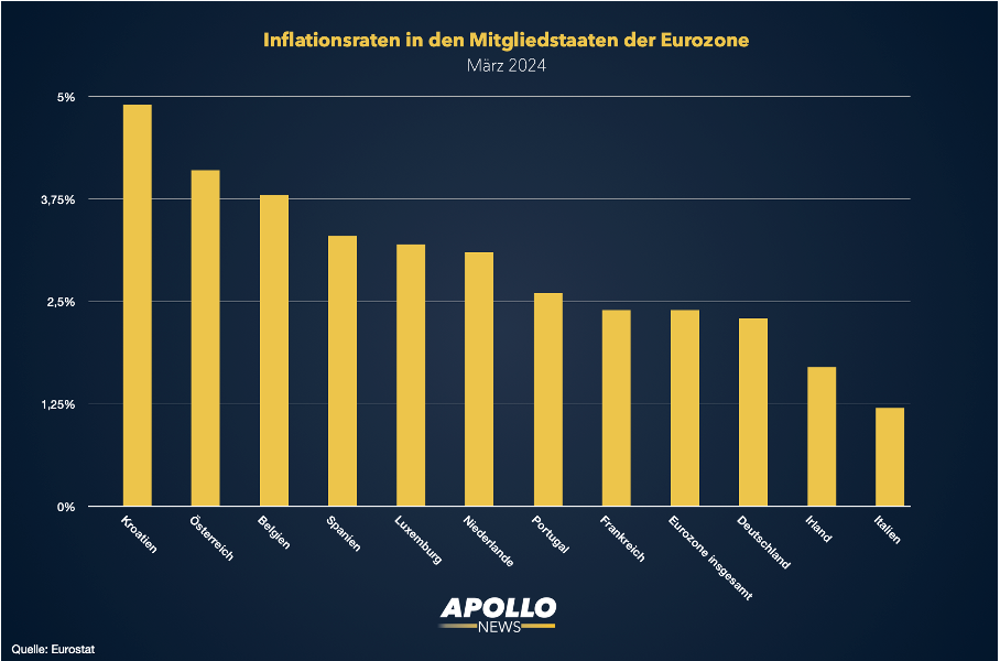 Betrachtet man die gesamte Eurozone und die einzelnen Volkswirtschaften, bleibt die Lage angespannt: Kroatien erlebt aktuell Teuerungsraten von fast 5 Prozent. Nun sind die Daten des Balkanlandes aufgrund ihrer Wirtschaftskraft nicht aussagekräftig und sicherlich nicht bestimmend für die Preise in der Eurozone. Tonangebend sind Deutschland und Frankreich, die beide wieder steigende Inflationsraten erleben. Dazu kommen Spanien (aktuell 3,3 Prozent) und ebenfalls die Niederlande (aktuell 3,1 Prozent), welche in der Eurozone stark gewichtet werden und damit die Gesamtinflation beeinflussen.