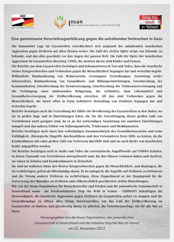 Was viele der deutschen Gruppe, die bei solchen Aktionen dabei sind, auch mit den Huthis eint, ist eine relativ offen zur Schau gestellte Abneigung gegen Israel: „Insan“, die Initiative „Stop the War on Yemen“ und die Jemenitische Gemeinschaft, die alle prominent bei Demos gegen den Anti-Huthi-Einsatz auftraten, nennen den von der Hamas begonnenen Krieg gegen Israel eine „israelische Aggression“ und sprechen von israelischen „Kriegsverbrechen“. Sie fordern, dass Israel den Kampf gegen die Hamas beendet.