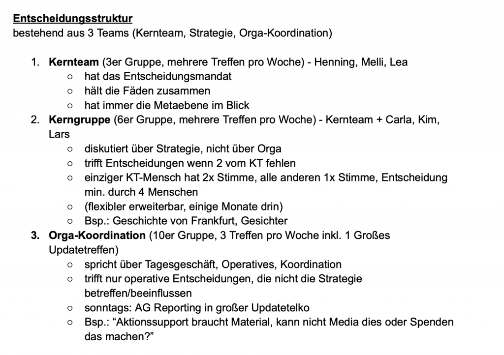 Ranghöchstes Team ist das 3-köpfige „Kernteam“, ihm gehören Henning Jeschke, Melanie Guttmann und Lea Bonasera an. Dieses „Kernteam“ habe dabei das „Entscheidungsmandat“ und treffe für die Organisation Entscheidungen, heißt es in internen Dokumenten. Es habe zudem die „Metaebene im Blick“.