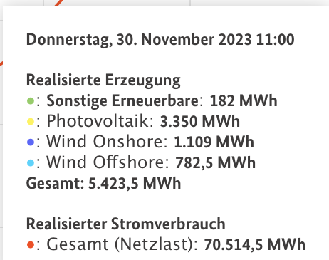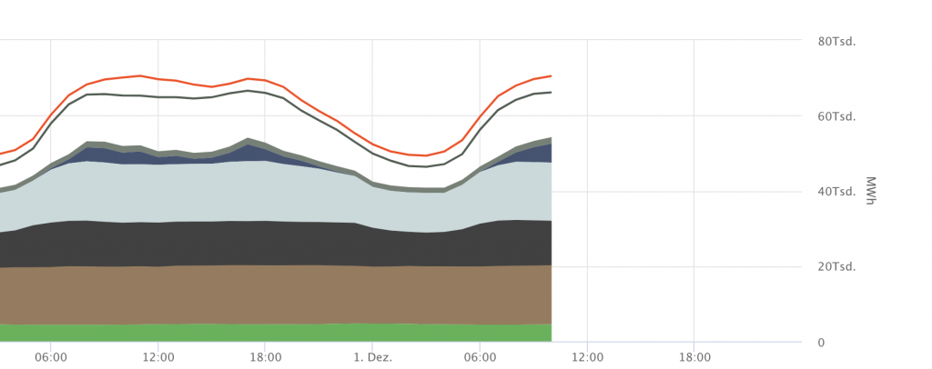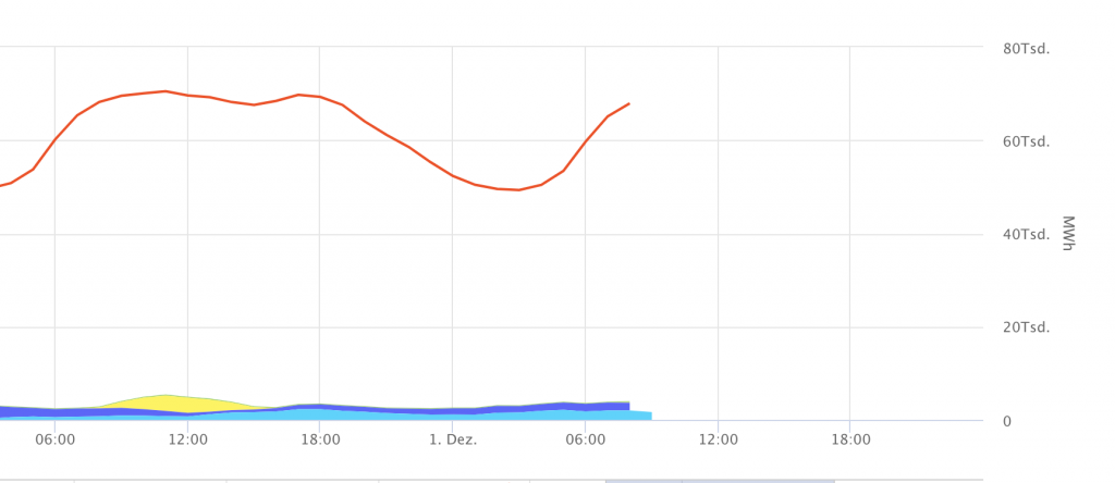 Die rote Kurve oben zeigt die gesamte Netzlast der Bundesrepublik. Die kleinen Blautöne unten sind der Anteil davon, der durch Windenergie (On- und Offshore) gewonnen wird, der gelb unterlegte Bereich ist der Beitrag der Solarenergie. Wie Sie sehen, sehen Sie wenig.